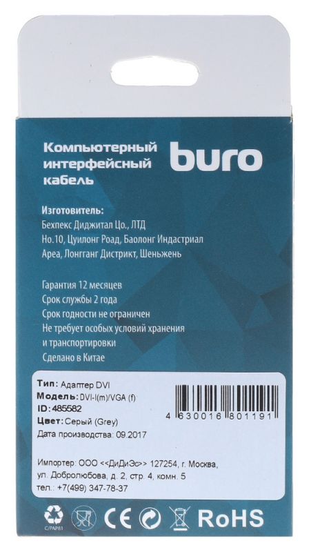 Адаптер Buro BHP RET ADA_DVI-VGA DVI-I(m) VGA (f) серый блистер