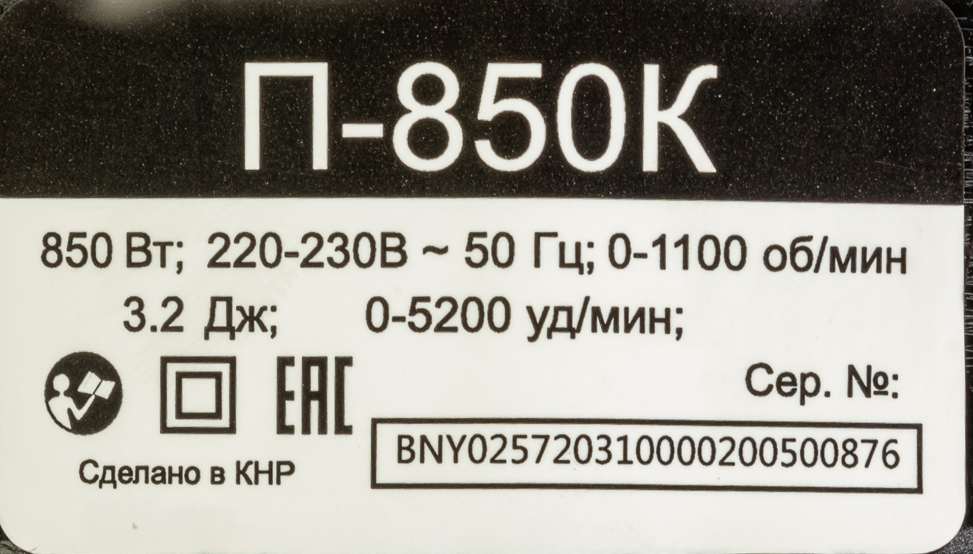 Перфоратор, ограничитель глубины сверления, боковая рукоятка, паспорт, упаковка, кейс пластмассовый, съемный ключевой патрон (для модели П-850К), пыльник (для модели П-850К). |