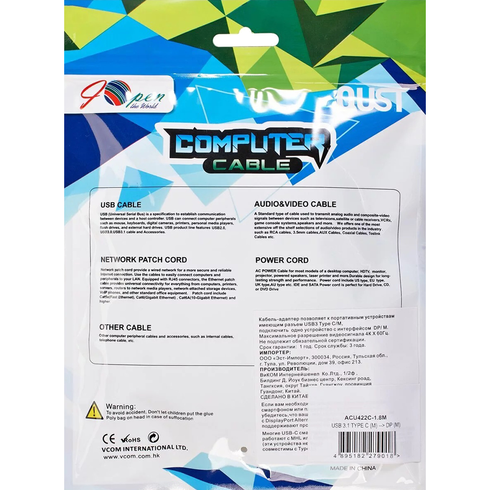 Кабель-адаптер USB 3.1 Type-Cm -->DP(m) 4K@60Hz, 1,8m iOpen (Aopen/Qust) <ACU422MC-1.8M> VCOM Кабель-переходник AOpen/Qust USB 3.1 Type C M/DisplayPort M (ACU422MC-1.8M)