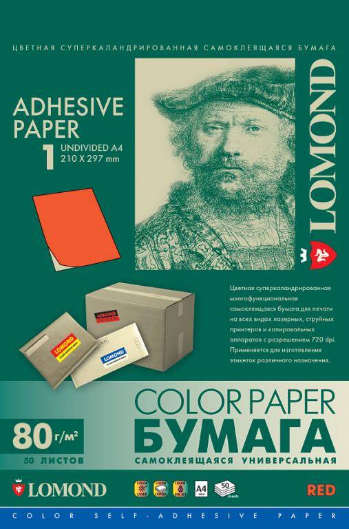 Самоклеящаяся цветная бумага LOMOND для этикеток, красная, A4, неделенная (210 x 297 мм), 80 г/м2, 50 листов