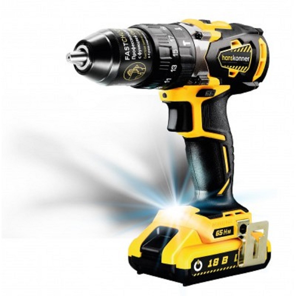 Hanskonner HCD1865BLI Дрель акк [HCD1865BLI] { б/щ,УДАР, 18В, Li-Ion,2скор,2 акк.2,4 Ач, 65Нм,13мм,БЫСТР.ЗАРЯД }
