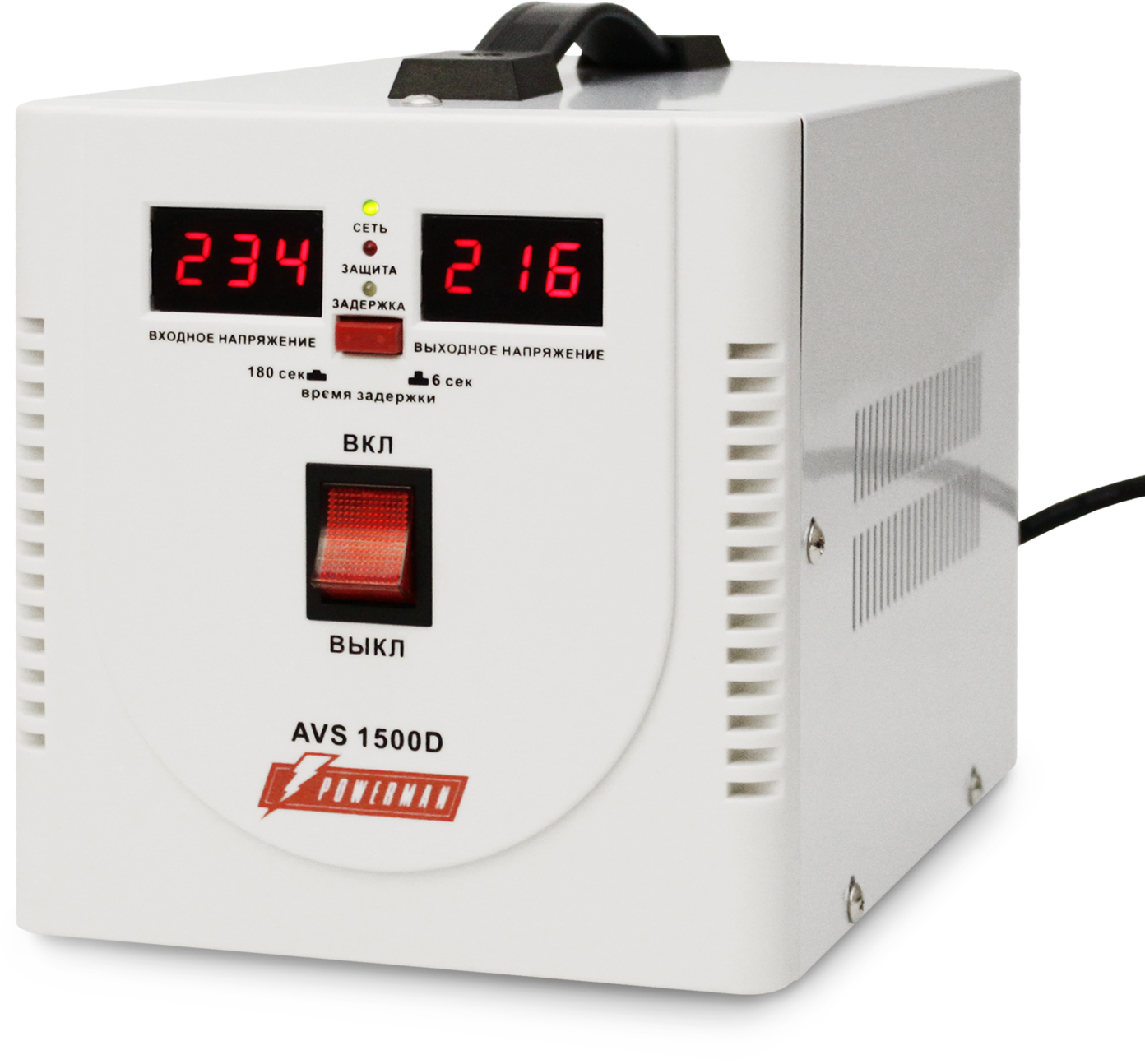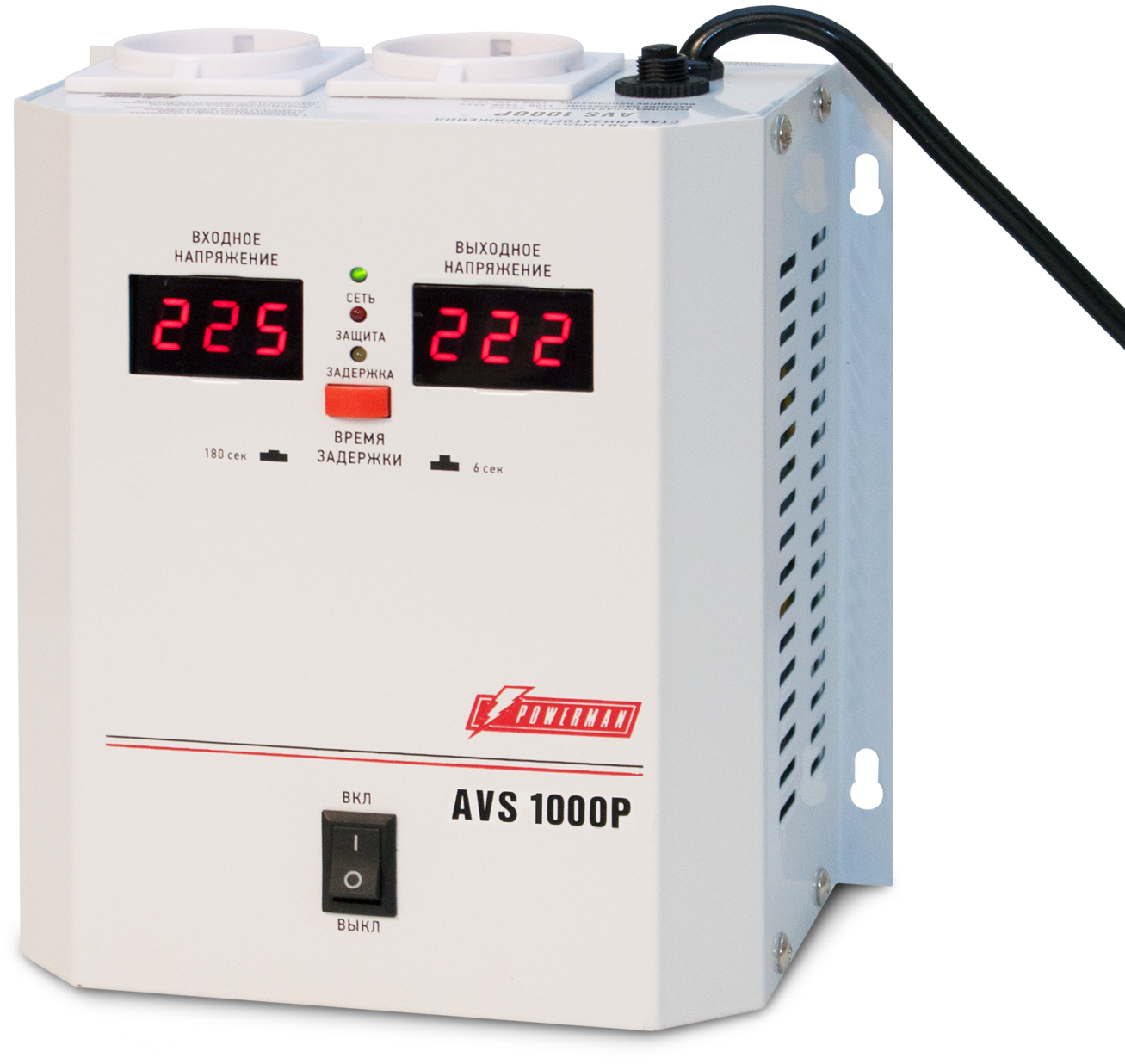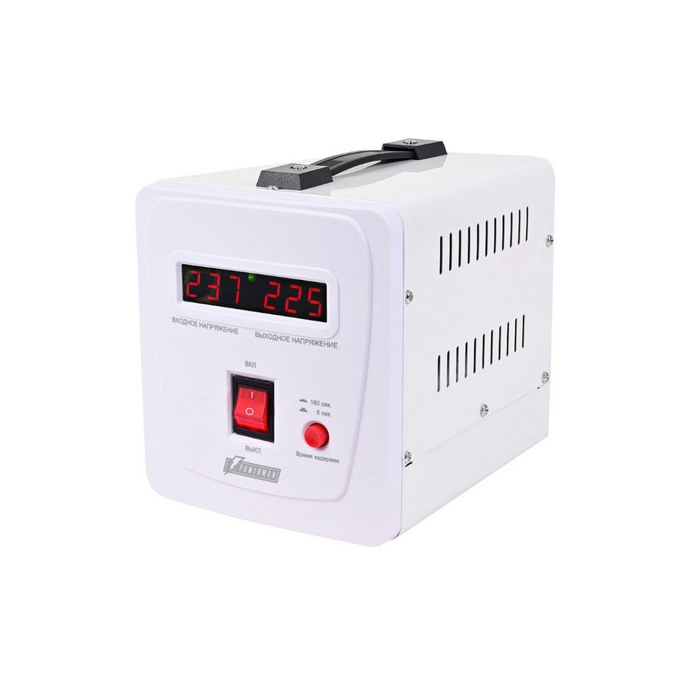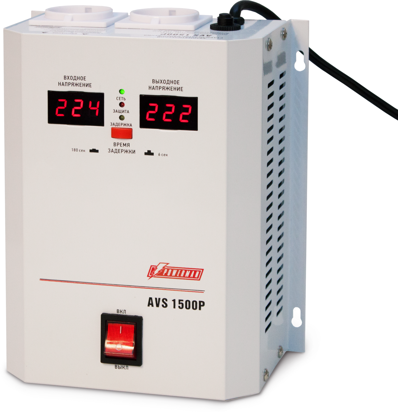 Стабилизатор POWERMAN AVS 1500P, ступенчатый регулятор, цифровые индикаторы уровней напряжения, 1500ВА, 110-260В, максимальный входной ток 12А, 2 евророзетки, IP-20, навесной, 215мм х 270мм х 110мм, 4.3 кг. POWERMAN AVS 1500P (POWERMAN AVS-1500P)
