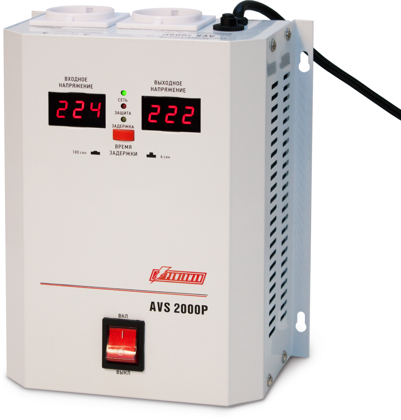 Стабилизатор POWERMAN AVS 2000P, ступенчатый регулятор, цифровые индикаторы уровней напряжения, 2000ВА, 110-260В, максимальный входной ток 15А, 2 евророзетки, IP-20, навесной, 215мм х 270мм х 110мм, 5.2 кг. POWERMAN AVS 2000P (POWERMAN AVS-2000P)