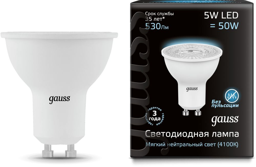 Лампа светодиодная Gauss MR16 5Вт цок.:GU10 спот 220B 4100K св.свеч.бел.нейт. MR16 (упак.:1шт) (101506205)